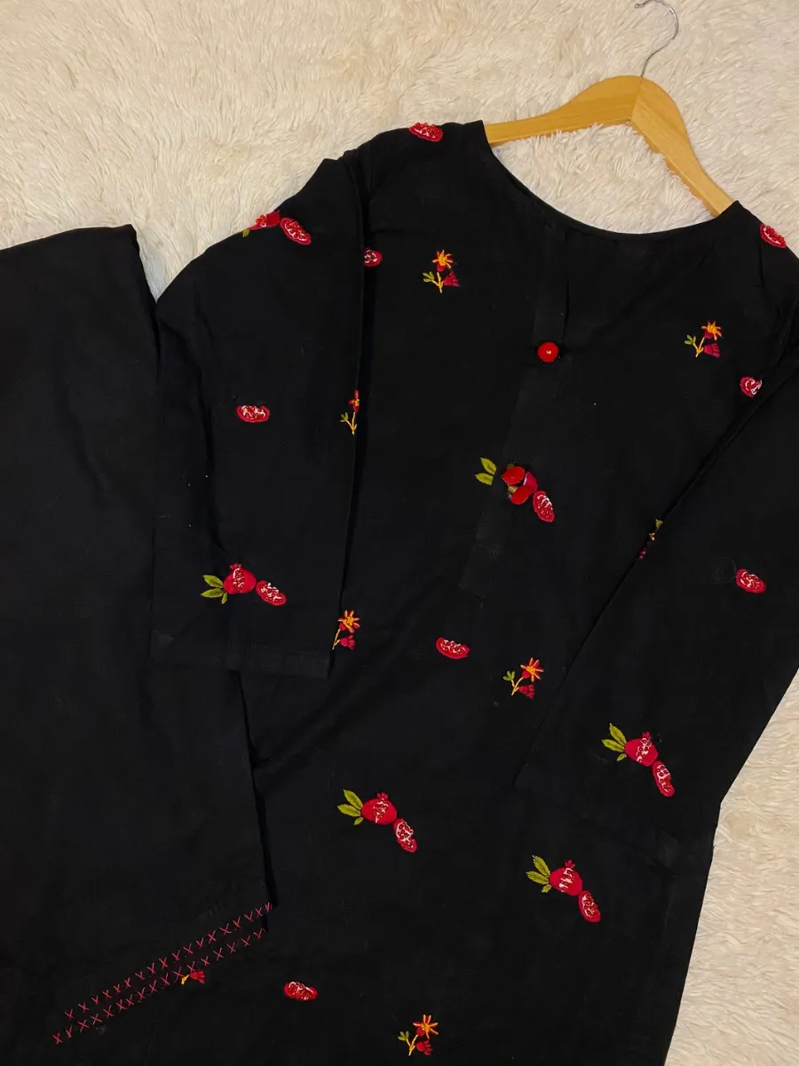 This Black Hand Embroidered Khaddar Shirt with Plain Trouser is a classic winter staple that exudes grace and style. The luxurious premium khaddar fabric provides warmth and comfort, making it perfect for the colder months. Featuring delicate embroidery spread evenly across the shirt, this design offers an understated yet sophisticated look. The plain trouser balances the intricate embroidery, making it ideal for formal or semi-formal occasions.