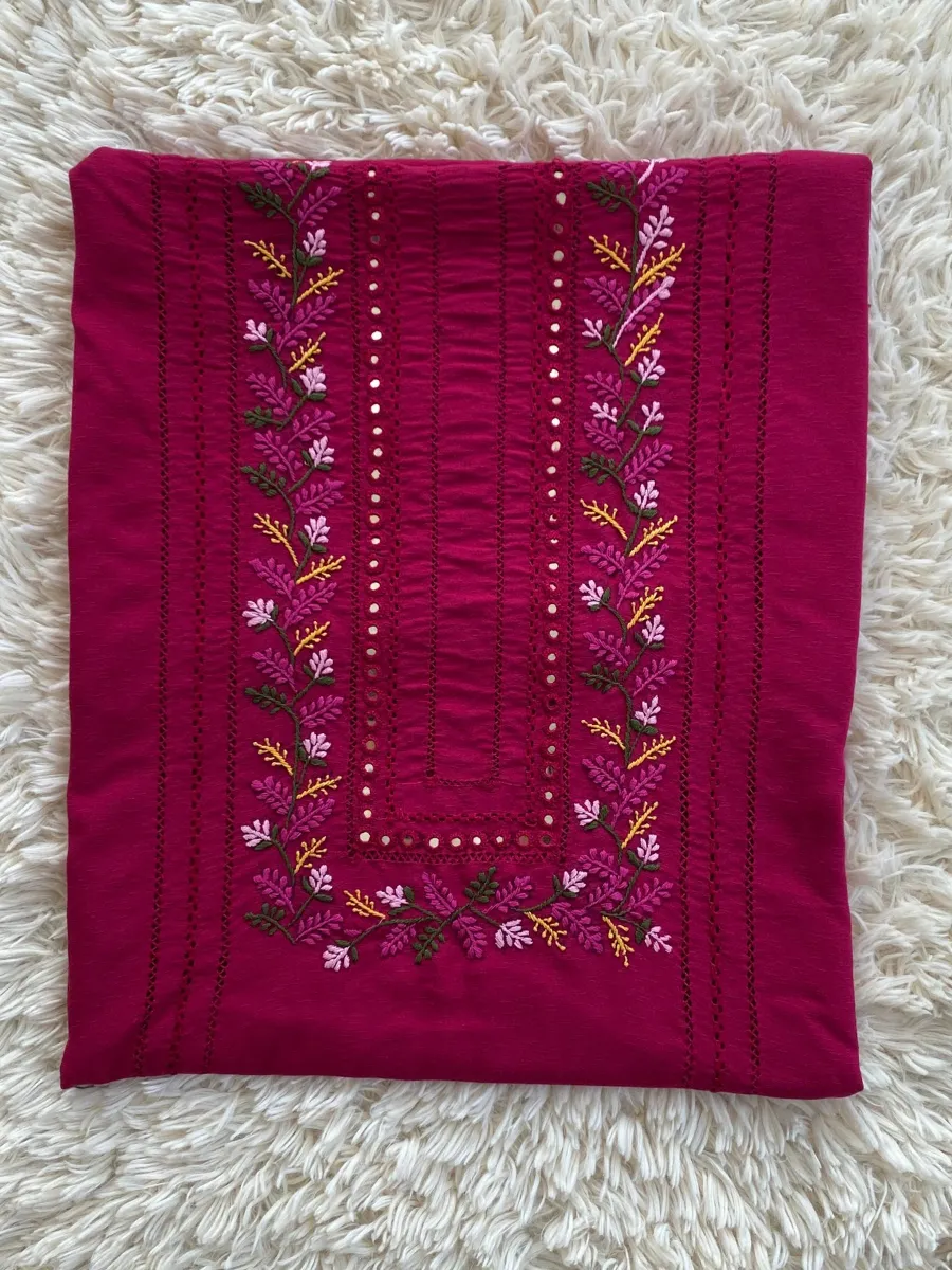 Elevate your wardrobe with this stunning outfit, featuring intricate handmade Tarkashi work along the neckline, sleeves, and front border. The all-over embroidery spray adds a subtle yet elegant texture to the fabric, paired with a classic plain trouser, offering a rich and timeless appeal.