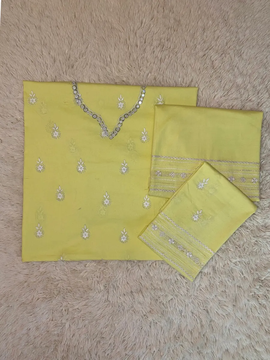 Experience timeless elegance with this stunning ensemble featuring exclusive Tarkashi embroidery on the border, and sleeves. The classic mirror work on the neck line of the shirt adds a touch of traditional glamour, perfectly complimented by a matching Tarkashi embroidered trouser. A perfect blend of heritage and style for any occasion.
