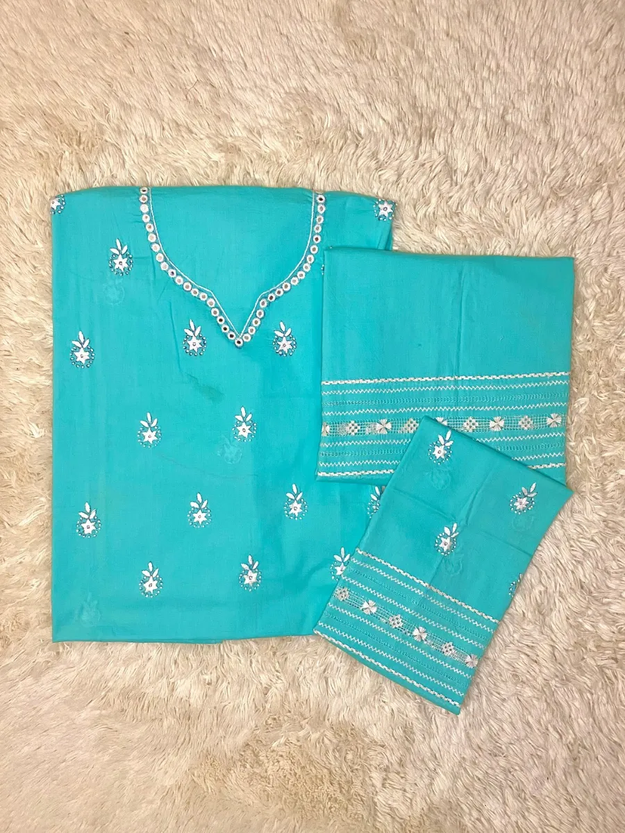 Experience timeless elegance with this stunning ensemble featuring exclusive Tarkashi embroidery on the border, and sleeves. The classic mirror work on the neck line of the shirt adds a touch of traditional glamour, perfectly complimented by a matching Tarkashi embroidered trouser. A perfect blend of heritage and style for any occasion.